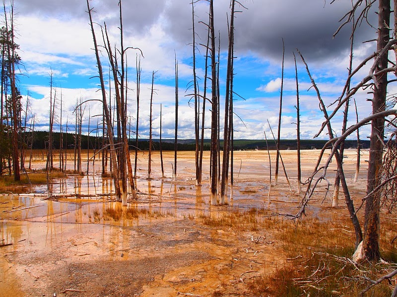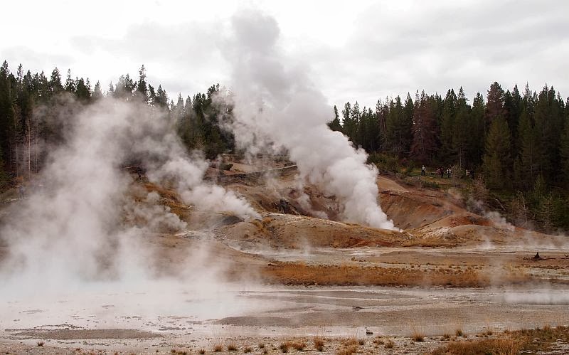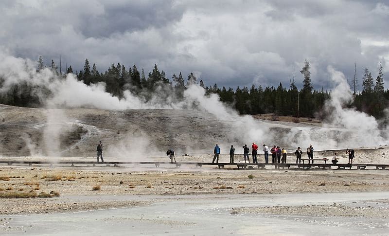 korkeana kohoavia höyrypilviä siellä sun täällä. Saavuimme Norris Geysir Basiniin, tuskastelimme autopaljoutta parkkipaikalla ja opastaulun kertomaa ”pitkää” kävelymatkaa. Se oli muistaakseni 2,5 km, koirien kanssa tuo olisi lyhyt lenkki, mutten ole koskaan ollut innokas lenkkeilemään ilman koiria :). Tuskastelu vaihtui kuitenkin melkoiseen äimistykseen, kun katselimme Norrisin alueella pienen kukkulan laelta Porcelan Basinia: