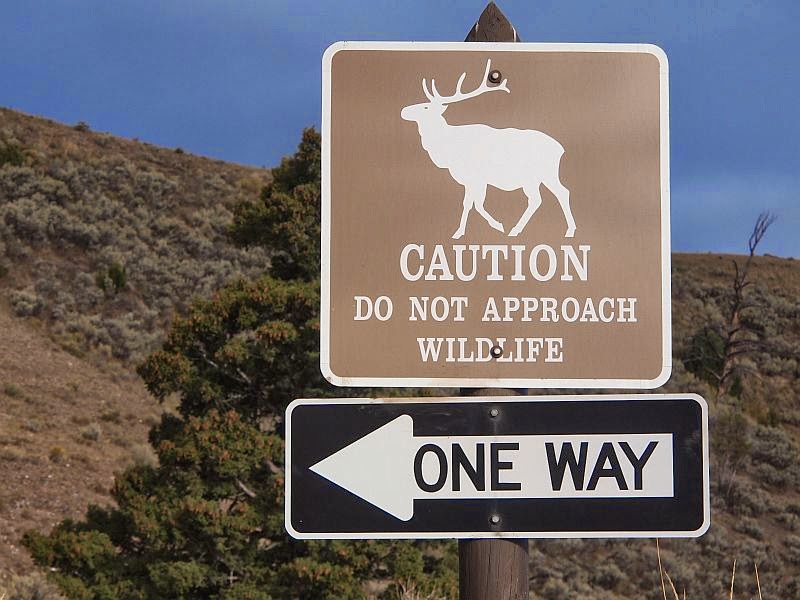 15.9. Matkan kolmantena päivänä heräsimme aikaisin aamulla. Oli vielä pimeää, kun poistuimme hieman rähjäisestä, mutta silti hyvin palvelleesta motellista ja lähdimme ajamaan kohti maailman ensimmäistä kansallispuistoa. Bozemanista ajoi noin tunnin Yellowstonen pohjoisportille. Puistoon maksaa sisälle 25 $ per auto ja sillä summalla saa ajella sisälle ja ulos puistosta seitsemän vuorokauden ajan niin usein kuin haluaa. Emme ehtineet ajaa Yellowstonen sisäpuolella kuin muutaman kilometrin, kun huomasimme ensin tien sivuun pysähtyneet kolme autoa ja niiden vieressä olevat ihmiset kameroiden kanssa. Heti sen jälkeen katse kiinnittyi siihen suuntaan, jonne heidän kameransa osoittivat. Tämä kyseinen kanadanhirvi hengaili ja kuopi vettä parinkymmenen metrin päässä: