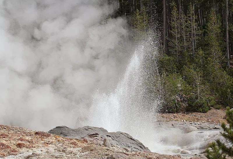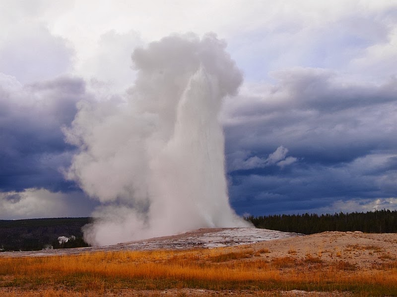 Tuon jälkeen suuntasimmekin sitten kohti päivän viimeistä etappia eli Old Faithfulia katsomaan. Se on Yellowstonen tunnetuin geysir. Nimi viittaa säännölliseen purkautumiseen, muttei se kuulema enää ole aivan yhtä uskollinen kuin se on ennen ollut. Purkausten väli on nykyään noin tunnista puoleentoista tuntiin. Olimme paikalla melko myöhään iltapäivällä ja lämpötila oli laskenut päivän reilusta kahdestakymmenestä asteesta reippaasti alle parinkymmenen. Värjöttelimme noin puolisen tuntia kymmenien muiden turistien kanssa Old Faithfulin ympärille rakennetuilla penkeillä ja odottelimme koska kymmenet tuhannet litrat kuumaa vettä pärskähtäisivät kymmenien metrien korkeuteen. Sitten se tapahtui.