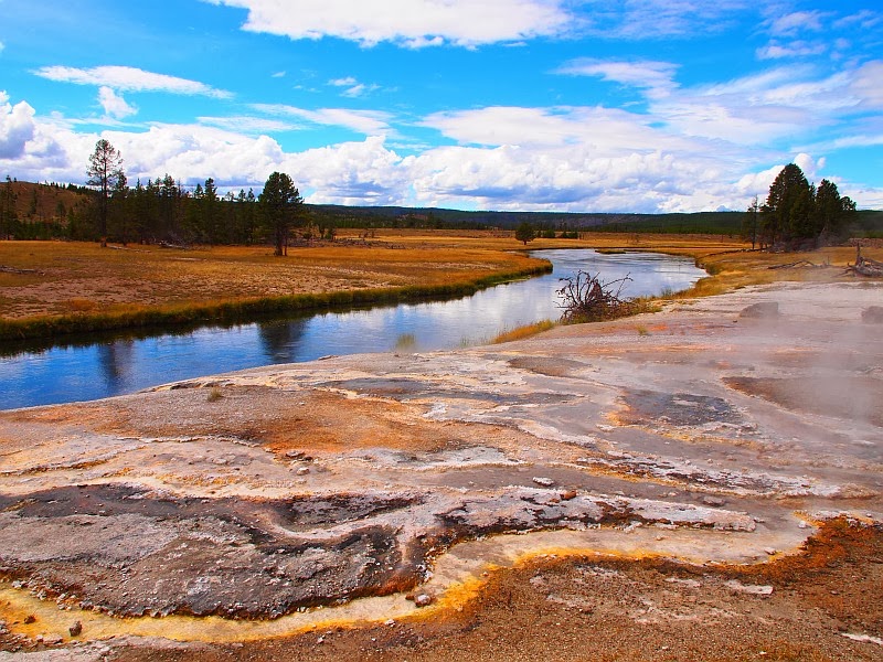 Saavuimme ensimmäisenä Mammoth Hot Springsiin. Olin toki vaikuttunut, mutta ennen kaikkea lähinnä innokas pääsemään eteenpäin, jotta olisi mahdollisuus nähdä eläimiä. Mammoth Hot Springs on yksi Yellowstonen tunnetuimmista nähtävyyksistä. Se muodostuu lukuisista kuumista lähteistä, jotka syövyttävät kalkkikiveä.