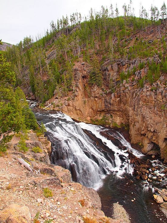 Yellowstonessa on satoja vesiputouksia. Muutaman pienemmän olimme jo ohittaneet ja nyt tulimme ensimmäisen hieman suuremman kohdalle. Tämä oli nimeltään Gibbon Falls.