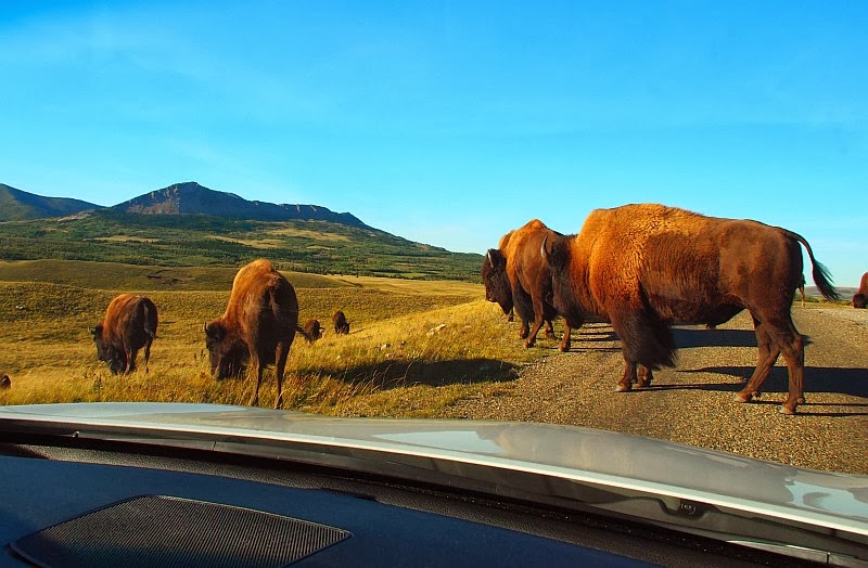 Meillä oli vielä viimeinen etappi jäljellä ennen kuin pääsisimme tosissamme ajamaan kohti Calgarya. Kansallispuiston kartassa nimittäin luki ”biisoniaitaus”. Meillä ei ollut mitään havaintoa, mitä se käytännössä tarkoittaisi, muttemme missään nimessä aikoneet vain ajaa sellaisen ohi. Biisoniaitaus osoittautui nimensä mukaisesti suureksi aitaukseksi, jonne sai kuka tahansa ajaa vapaasti autolla sisään biisoneiden sekaan. Kreisiä. Olen ihan varma, että Suomessa tuo päätettäisiin laittomaksi. Nyt kuitenkin oltiin Kanadassa ja sinne me sukellettiin Nissanilla biisoneiden sekaan.