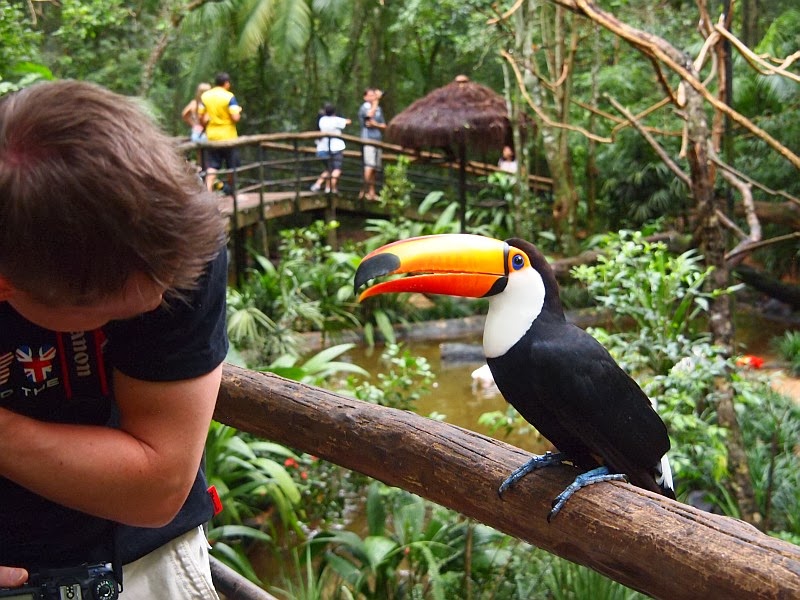 Bird Park Iguazussa asustaa yli 900 lintua, jotka edustavat yli 150 lajia. Kaikki linnut ovat peräisin joko eläintarhoista tai IBAMA-kasvattajilta (IBAMA = The Brazilian Institute of Environment and Renewable Natural Resources). Yhtään lintua ei ole pyydystetty luonnosta tarhaoloihin. Valitettavasti ihan kaikilla linnuilla ei ollut niin isot häkit kuin olisi voinut toivoa. Se mikä tuolla kuitenkin oli todella upeaa, oli isot lentohäkit, joissa sai kävellä sisällä. Ja isoilla tarkoitan todella suuria. Välillä unohti, että ympärillä edes oli verkot. Alla olevassa kuvassa näkyy myös ”hullu kana”, joka hieman häiritsi tukaanien ihastalua yrittämällä nokkia kaikkien jalkoja. Näette kuinka brasilialainen äiti yrittää suojella lastaan. 😀 ”Kana” myös lähti jahtaamaan, jos sitä lähti karkuun. En ymmärrä kanalintujen (tai edes tiedä onko tuo sellainen) psykologiaa, joten kyseisen yksilön ihmisiin suuntautuneet patoumat jäävät mysteeriksi?