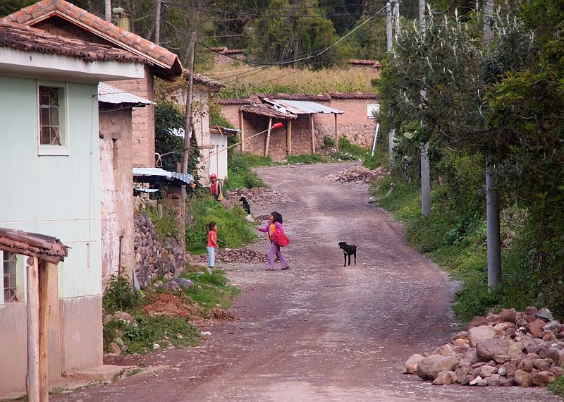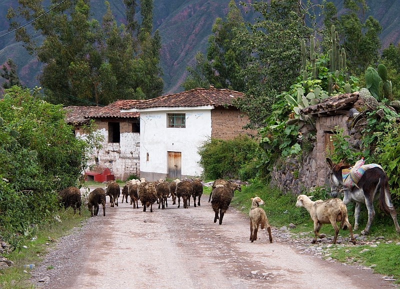 Edellisessä postauksessa kirjoitin vierailustamme Urubamban kylässä. Palasimme hotellille syömään. Lähdimme sen jälkeen kävelemään hotellin viereistä hiekkatietä ylös vuorenrinnettä katsomaan lähemmin kuinka ihmiset asuivat Perun maaseudulla. Ohut vuoristoilma sai meidät puuskuttamaan hyvin nopeasti ja Tomi oli hieman epäileväinen sen suhteen olisiko tuolla mitään nähtävää. Ei mennyt kuitenkaan montaa minuuttia kuin kävelyretkemme jo palkittiin. Sivupolulta tuli paimen lampaiden kanssa. Mukana oli myös aasi kantojuhtana ja muutama koira, jotka eivät valitettavasti näy tässä kuvassa.