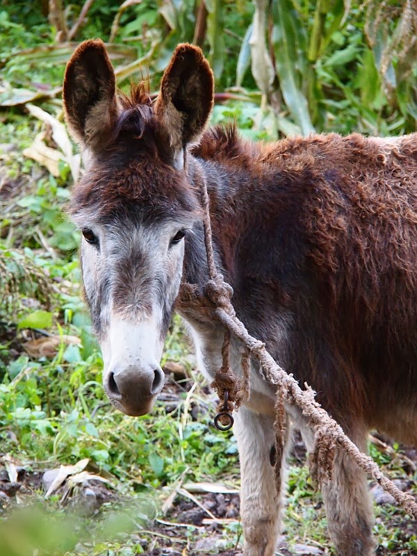 Useilla pihoilla eleli suloisessa sekamelskassa kanoja, lampaita, sikoja lehmiä ja koiria. En voinut olla ajattelematta miten onnellisia eläimiä tuolla eleli verrattuna tehotuotantoeläimiin. Tuolla ei ollut suuria kanaloita tai sikaloita, vaan melkein jokaisella perheellä eläimiä omalla pihalla omiksi tarpeikseen. Ilmasto sallii eläinten pitämisen ulkona ympäri vuoden. Siitä en ole aivan varma kuinka hyvää aasille tekee olla kaulasta sidottuna. Näitä näki aika paljon.