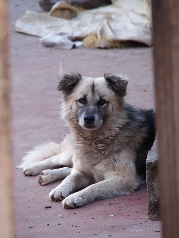 Melkein joka talon pihassa tai lähettyvillä oli koira tai useampi. Kahta koiraa lukuunottamatta ne eivät haukkuneet meitä, eivätkä halunneet tehdä tuttavuutta. Ne olivat varautuneita ja lähtivät karkuun, kun yritin houkutella niitä moikkaamaan. Tämä söpö kaveri tiiraili meitä omalta pihaltaan ja luikki talon taakse piiloon, kun aloin puhua sille.