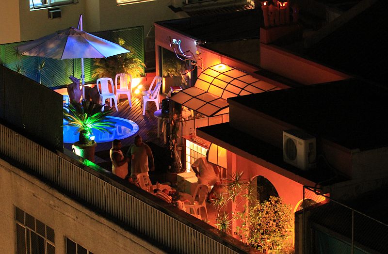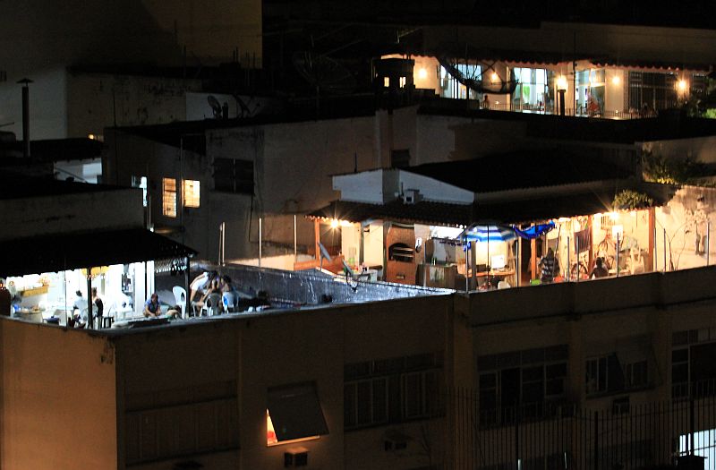Vetäydyimme hotellille ja pimeän tullen kiipesimme hotellin katolle sen vaatimattomalle uima-allasalueelle. Vaikka allas ei ollut kummoinen, näkymät sieltä olivat hyvät. Näytti melko uskomattomalta, kun huomasimme rantaan ilmestyneen viitisen isoa risteilijää, joilla risteilyllä olijat odottivat illan ilotulitusta varmasti yhtä paljon kuin mekin. Valitettavasti kuvaustaidoillamme ei kameraan tallentunut pimeällä niistä yhtään hyvää kuvaa. Sen sijaan lähitaloissa uuttavuotta kattoterasseillaan juhlivia paikallisia kuvasimme paparazzin lailla ja saimme pari jotenkuten julkaisukelpoistakin taltioitua.