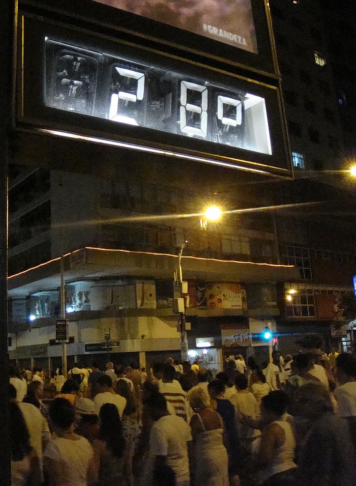 Yhdentoista jälkeen suuntasimme rantahumuun muiden reveillonin odottajien seuraan. Copacabanan kadut olivat suljettuna liikenteeltä useiden korttelien matkalta, joten siellä sai kävellä vaikka keskellä katua. Olimme pukeutuneet paikallisten tavoin mahdollisimman valkoisiin vaatteisiin. Brasilialaisten uskomuksen mukaan etenkin mustaan pukeutuminen uutenavuotena tuo huonoa onnea koko seuraavan vuoden ajalle. Sellaista riskiä emme tietenkään halunneet ottaa. Samoin halusimme minimoida ryöstetyksi tulemisen riskit ja otimme mukaamme vain hotellihuoneen avaimen ja pienen pokkarikameran.