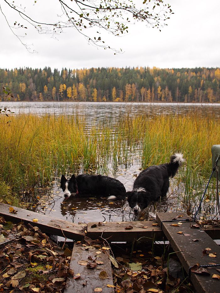 Olen käynyt Aulangon kauniissa maisemissa viimeksi lapsena. Tuntuu aivan käsittämättömältä, etten ollut käynyt siellä aikuisiällä, sillä asumme vain tunnin ajomatkan päässä. Aiemmin kirjoittelin Oodin Suomen metsille, mutta suurimman osan ajasta tallaan koirien kanssa näitä meidän lähimaastojamme. Täytyy jatkossa yrittää suunnata useammin uusiin maisemiin, koska se todellakin piristää. Koiratkin olivat innoissaan vieraista tuoksuista. Viileästä syyssäästä huolimatta ne ampaisivat suoraan veteen rantaan tultuamme.