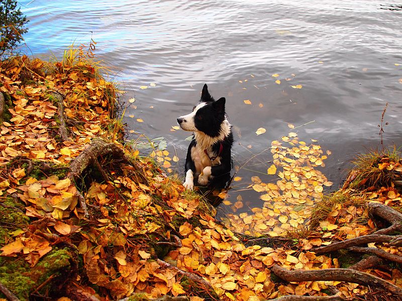 Välillä jouduin pelastamaan bordercollien pulasta, kun reppana sukelsi järveen kohdasta, josta ei enää päässytkään takaisin rannalle. Aidalle ehti tulla jo pieni paniikki ennen kuin kävin kiskomassa sen ylös vedestä. Hetken päästä Yumikin oli jumissa samassa kohdassa…