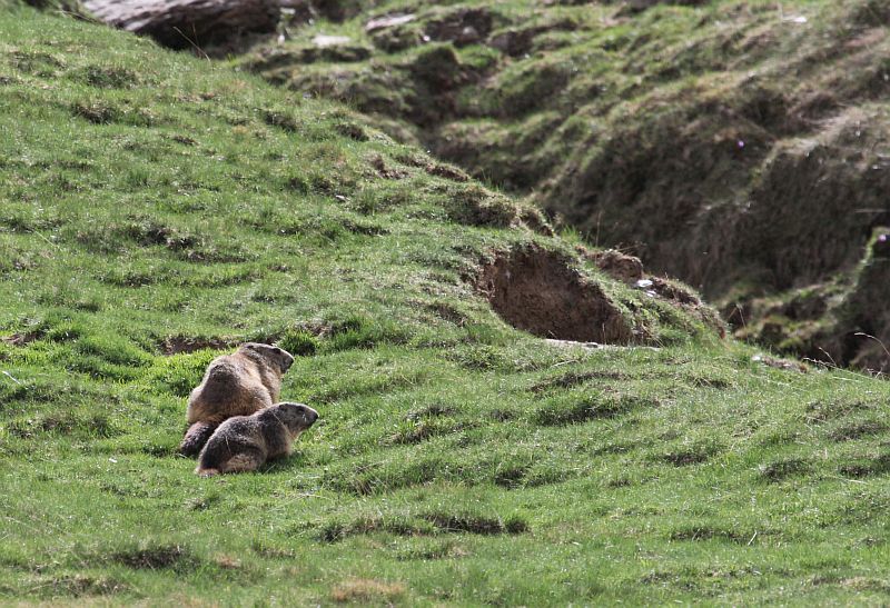 Alistuneena epäonnisesta murmelijahdista hyppäsimme takaisin autoon. Emme kuitenkaan ehtineet ajella varmaan paria sataa metriä pidemmälle, kun seuraavat murmelit jo viipottivat viereistä rinnettä pitkin. Tällä kertaa kuskikin oli jo enemmän varuillaan ja auto pysähtyi hyvin nopeasti. Murmelit eivät pelänneet autoa ollenkaan niin paljon, kuin ulkona kameroiden kanssa heiluvia turisteja, joten saimme ikuistettua useaan otteeseen näitä isoja jyrsijöitä Fiatin ikkunoiden tarjoaman kuvaussuojan turvin.