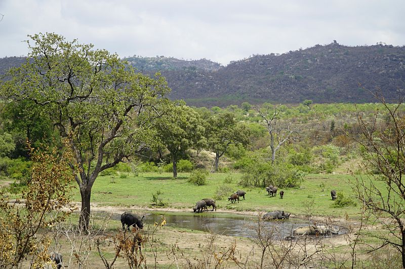 | Sarvikuonoja ja vesipuhveleita juomapaikkalla Krugerin kansallispuistossa marraskuussa 2014. |