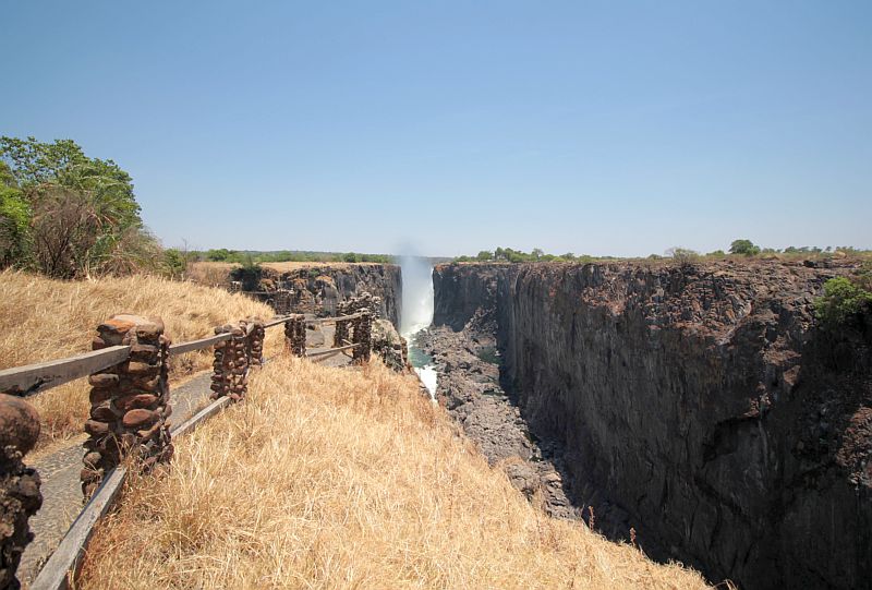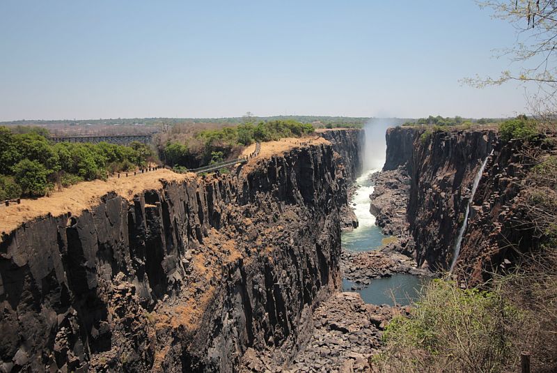 | Kuivat putoukset. Vesihöyry nousee Zimbabwen puolelta. |